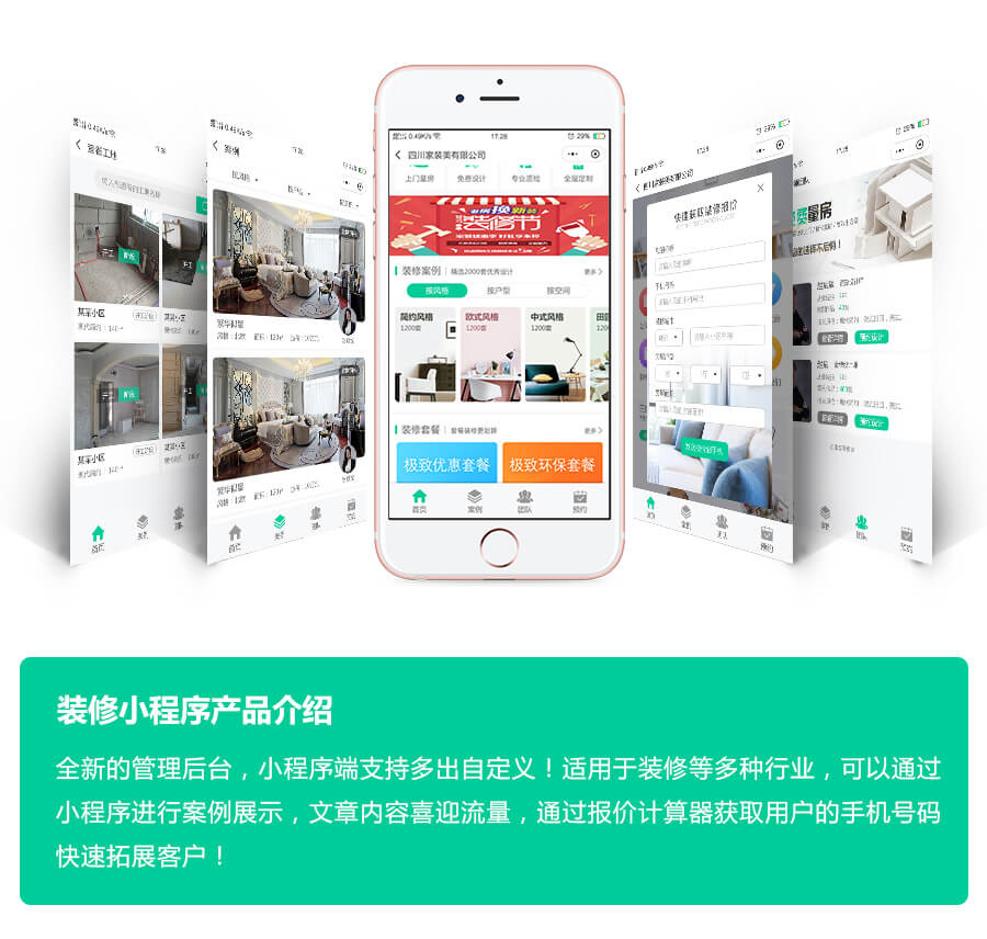 解决装修公司微信端快速传播营销的功能。公司设置,促销设置,小区设置,案例设置,团队设置,电话设置,可用VR展示,支持查看工地进度。
